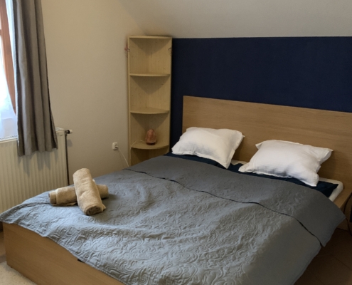 A külön bejárattal rendelkező emeleten összesen 7 szoba áll vendégeink rendelkezésére: 5 kétszemélyes, franciaágyas, valamint 2 négyszemélyes, emeletes vagy kanapéágyas elrendezésű szoba. Az emelet három elkülönített blokkra tagolódik, amelyek mindegyikéhez 1-1 fürdőszoba tartozik, összesen 5 zuhanyzóval és 5 mosdóval, így a nagyobb társaságok számára is kényelmes elosztást biztosít. Vendégeink kényelméről ágyneművel és törölközővel is gondoskodunk. A könnyebb tájékozódás és tervezés érdekében a képek között egy egyszerűsített alaprajz is megtalálható, amely bemutatja a szobák és fürdők elhelyezkedését.