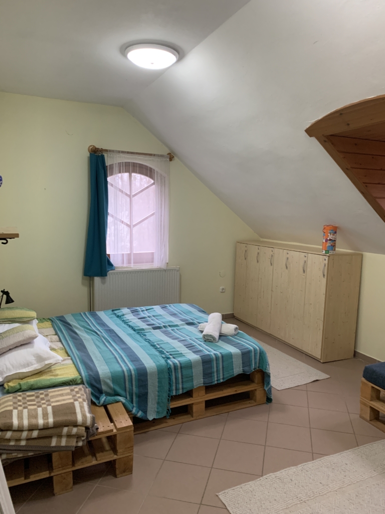 A külön bejárattal rendelkező emeleten 5 kétszemélyes (franciaágyas) és 2 négyszemélyes (emeletes/kanapéágyas) szoba található 3 blokkra osztva, 6-2-10 fő elosztásban. Mindegyik blokkhoz külön fürdőszoba van, összesen 5 zuhanyzóval és 5 mosdóval. Ágyneműt és törölközőt biztosítunk.